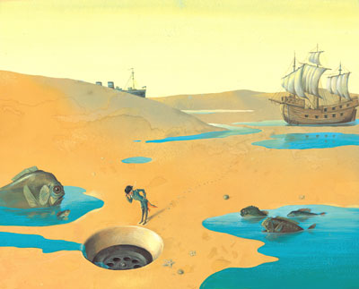 Aljoscha BlauDas verschwundene Meer (2007) Originalillustration für »Der Ritt auf dem Seepferd«, Aufbau Verlag, Berlin 2007 Gouache auf Papier Motiv: 38 x 31 cm 2000 Euro zzgl. 6,50 Euro Versandkosten