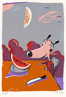 Thomas M. MüllerMaus mit Melone (2004) Siebdruck Motiv: 15,7 x 22,4 cm Blatt: 20,7 x 28,7 cm Auflage: 35 nummeriert und signiert 90 Euro zzgl. 6,50 Euro Versandkosten